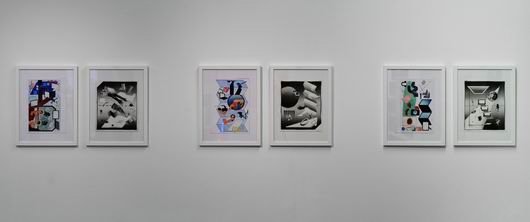 L’impesanteur se déploie dans cette série de dessins réalisés à quatre mains par Clément Fourment et Rob Miles. Quittant la feuille du premier pour basculer dans la mise en scène du second, les motifs circulent d’un espace dessiné à l’autre. Si Rob Miles conserve une certaine théâtralité de la représentation tout en accentuant la planéité du dessin, Clément Fourment tend à l’abstraction en quittant tout cadre de référence pour faire flotter les objets dans l’espace de la feuille de papier lui-même.