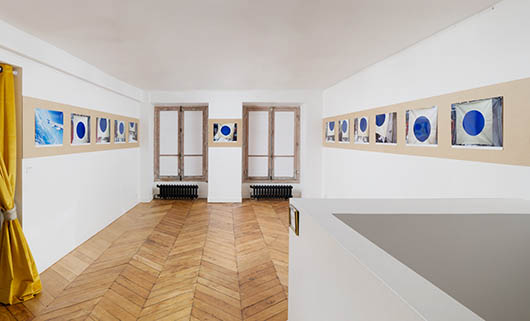 À bord de l’avion zero-g qui permet d’accéder à des périodes d’impesanteur, Alain Bublex a tenté de photographier une cible bleue fixe en laissant son corps en impesanteur déterminer le cadrage de l’image. L’artiste a mis en jeu la performance de son outil de création, un appareil photographique conçu pour réaliser des prises de vue de paysage, dans un environnement particulièrement contraignant. La série de photographies témoigne de l’expérience mise en œuvre par Alain Bublex pour pousser à ses limites son dispositif de création artistique.
