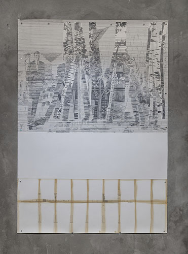 À partir des archives photographiques et graphiques du Cnes, Benoît Géhanne représente les pionniers de l’aventure spatiale sur le chantier du premier centre technique du Cnes à Brétigny-sur-Orge. Leurs silhouettes se confondent avec l’aire de point fixe camouflée dans la forêt pour réaliser les essais de moteur. Alors que les pionniers se projettent déjà au-delà de la Terre, s’esquissent sous leurs pieds les infrastructures à venir à travers les plis d’un plan de construction du futur Centre spatial de Toulouse.