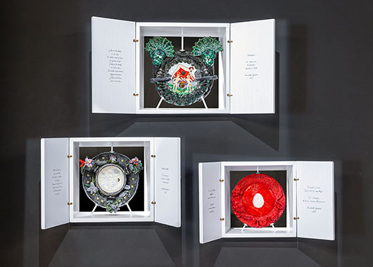 Inspirée par les boucliers thermiques en céramiques des véhicules spatiaux, Annabelle Guetatra conçoit des objets protecteurs consacrés au rover Persévérance qui, substitut d’une présence humaine, récolte des échantillons destinés à mieux connaître la planète Mars, à la Station spatiale internationale dans laquelle perdure, par nécessité, la collaboration internationale ou encore aux deux satellites géodésiques, Stella et Starlette, placés en orbite terrestre pour mille ans et qui renvoient continuellement des rayons laser lancés depuis le sol terrestre afin de documenter le champ de gravité de la Terre. Ces objets magiques conjuguent les références à plusieurs cultures rappelant la place qu’occupe l’Espace dans le développement des spiritualités.